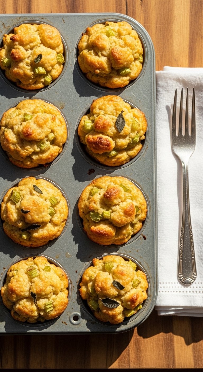 Stuffin' muffins are portable, golden bites of classic stuffing—crispy edges and a soft, herb-packed center. They bake faster than a full pan, so they solve oven crowding and make serving a breeze for kids and grown-ups. The texture contrast—crunchy top and moist interior—smells like holiday dinner.