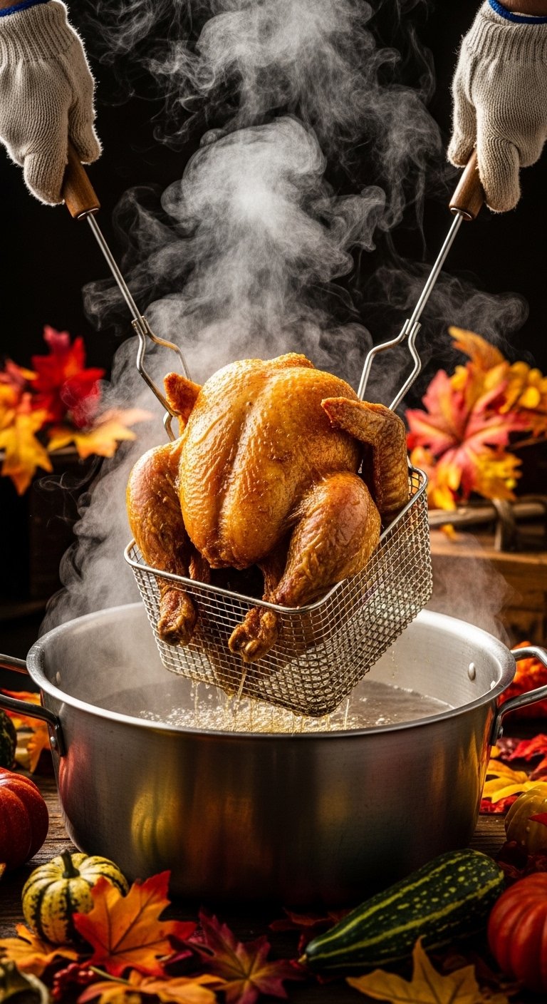 - Fry 3–4 minutes per pound (approx 35–45 minutes for a 10–12 lb bird) until internal temp reads 165°F at the thickest part of thigh using an instant-read thermometer.