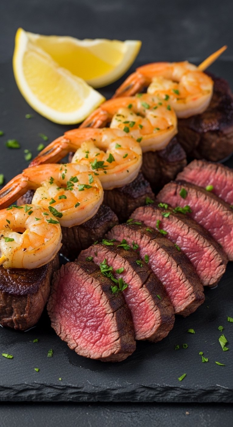 Serve on warmed plates with lemon wedges and a sprinkle of parsley. Pair with mashed potatoes and roasted vegetables. Leftover steak and shrimp store separately in airtight containers up to 3 days; reheat gently.